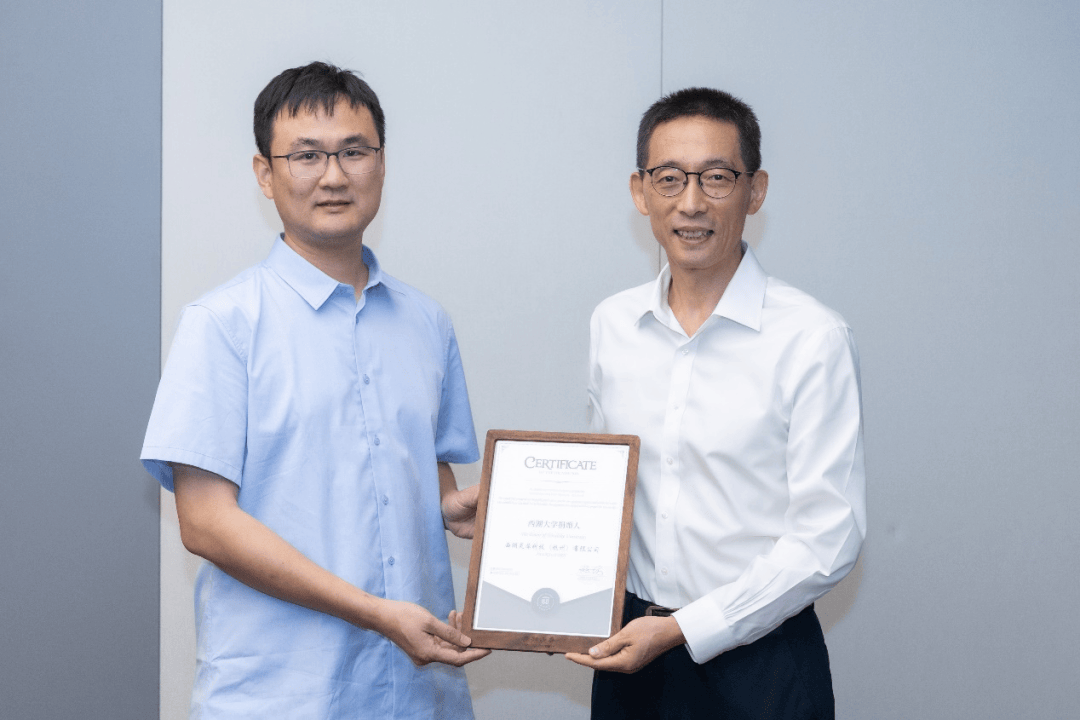 荷湖科技董事长杨懿率领团队研发的智能显微仪器,基于正在博士后期间的研究堆集和西湖大学的科研支持,他代表公司向西湖大学成长基金会捐赠。